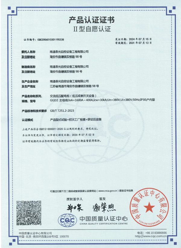 交流低壓配電柜認(rèn)證證書